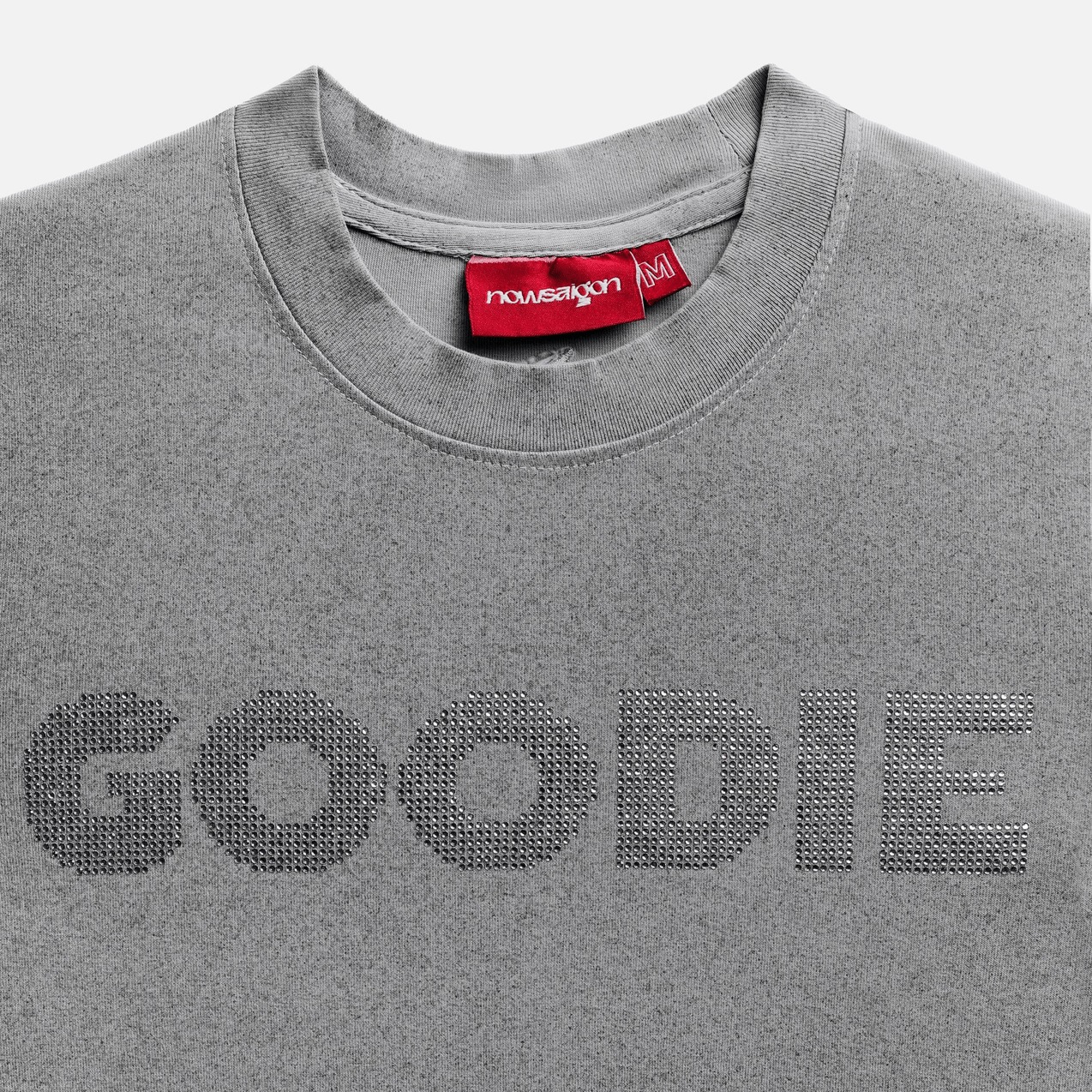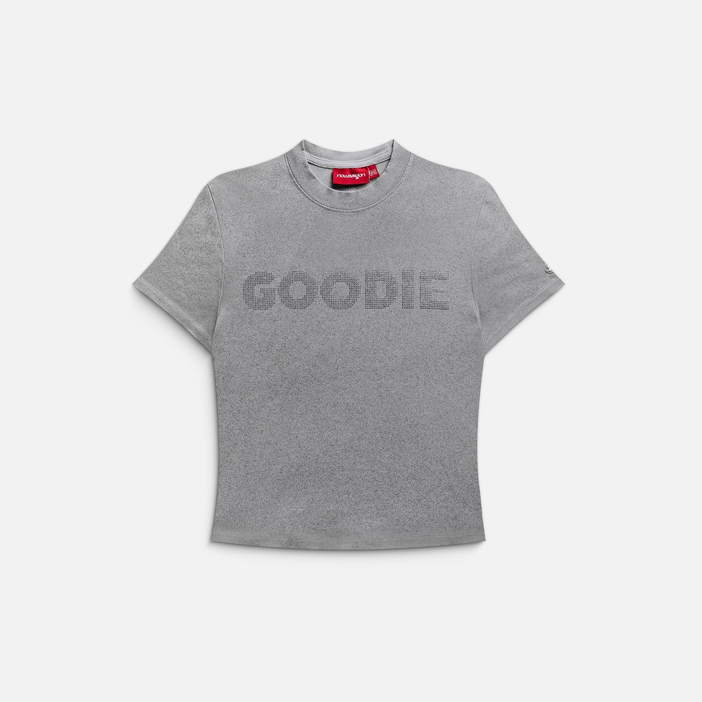 Form baby tee, nổi bật với kỹ thuật đính đá tinh xảo và logo thêu chỉ kim tuyến lấp lánh ở thân sau. Điểm đặc trưng thêu nổi logo ở tay áo, tạo nên vẻ ngoài hiện đại, sắc sảo và đầy phong cách.