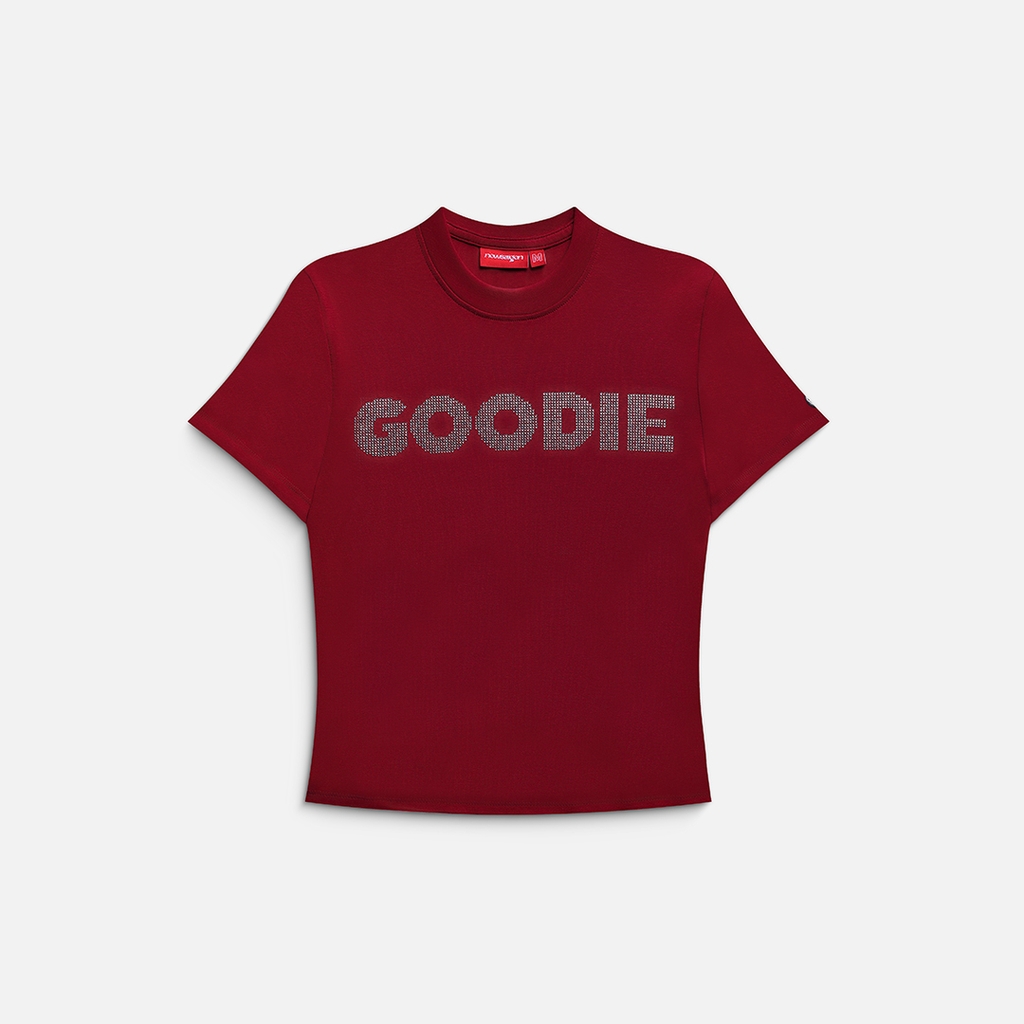 Form baby tee, nổi bật với kỹ thuật đính đá tinh xảo và logo thêu chỉ kim tuyến lấp lánh ở thân sau. Điểm đặc trưng thêu nổi logo ở tay áo, tạo nên vẻ ngoài hiện đại, sắc sảo và đầy phong cách.